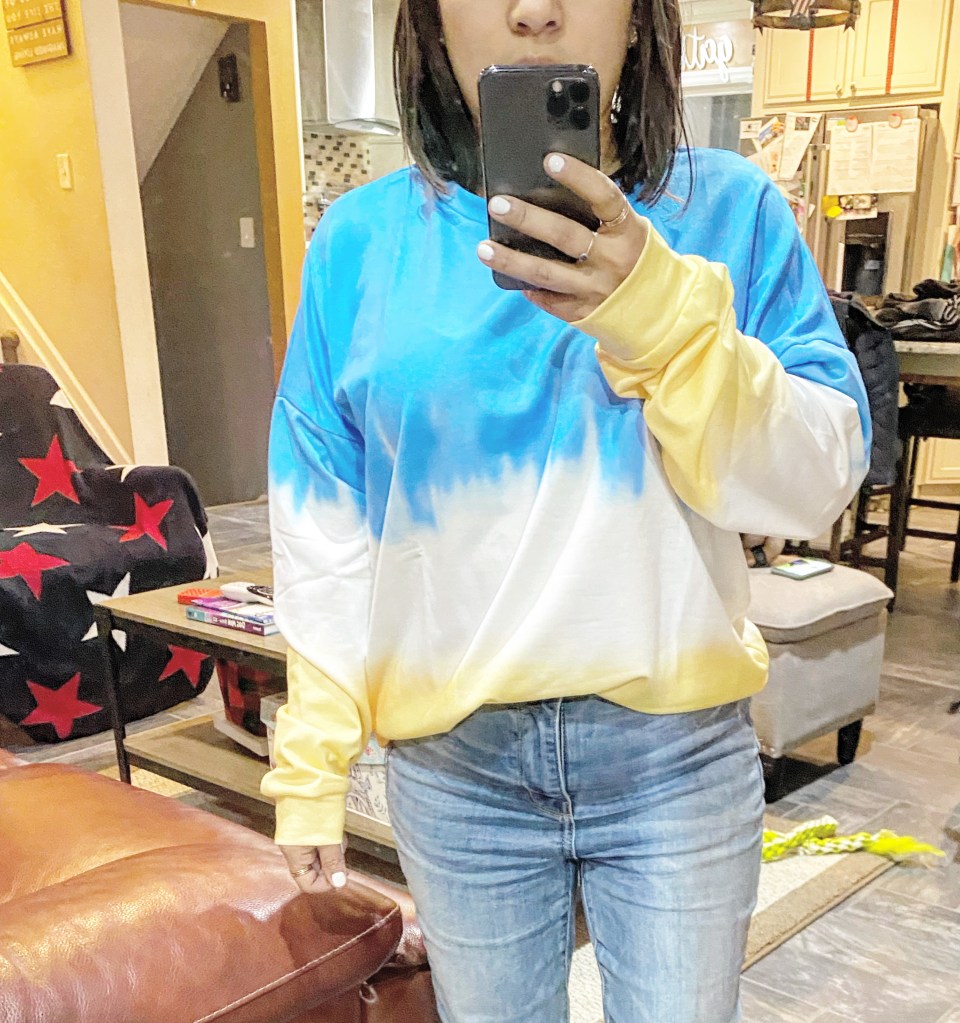 My tie dyed sweatshirt was delivered yesterday.. I love the feel and I love the fit This amazing find is from Amazon Dress well crew neck tie dye pull over I am wearing a size S