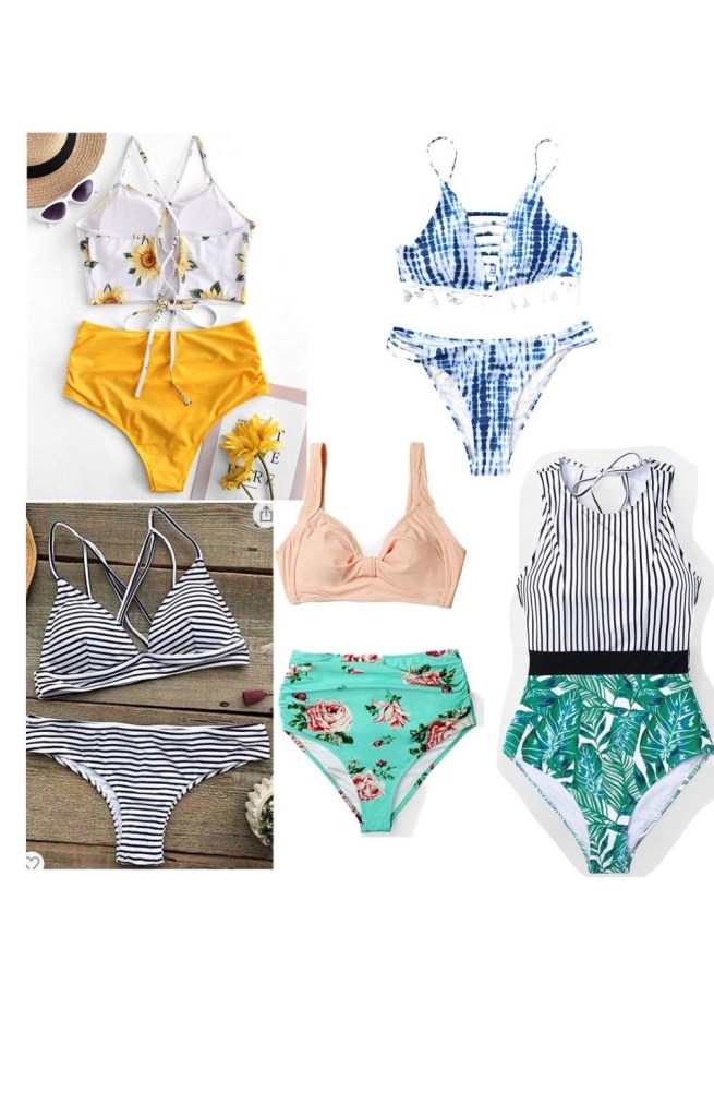 CUPSHE strip print bikini set – Link here for details CUPSHE stripe halter one piece – Linked here CUPSHE floral peach high waisted bikini set Linked here CUPSHE Tie Dye two price bikini set Linked here ZAFUL Leaf Print High Waited bikini set Linked here